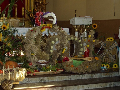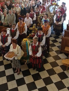 Reprezentanci z miejscowości wchodzących w skład parafii tradycyjnie przyniosły do kościoła parafialnego piękne wieńce żniwne, bochenki chleba kwiaty i zioła, by tu złożyć je w ofierze i w ten sposób podziękować za tegoroczny zbiór planów, które w tym roku odbywały się w bardzo ciężkich warunkach.