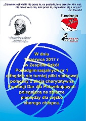 W dniu 1 czerwca 2017 r. (czwartek) w nowej hali Zespołu Szkół Ponadgimnazjalnych nr 1 w Opocznie o godz. 9:00 rozegrany zostanie charytatywny turniej towarzyski piłki siatkowej mężczyzn. Turniej ten połączony jest z akcją organizowaną przez Fundację Dar dla Potrzebujących \”Pomocna Dłoń\”, a zebrane pieniądze będą przeznaczone na pomoc choremu na raka chłopcu z gminy Opoczno. Zdiagnozowano u niego nieklasyczną postać choroby Hodgkina ? CHŁONIAK ? RAK WĘZŁÓW CHŁONNYCH.