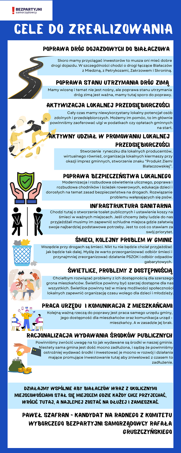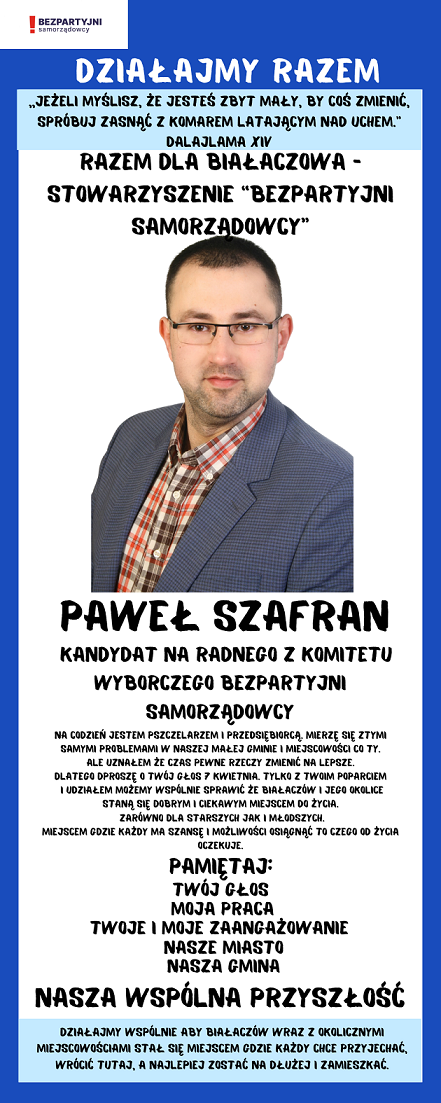 Mówi się że pierwsza jaskółka wiosny nie czyni. Przesłany przez Pana Pawła Szafrana, kandydata na Radnego do Rady Miasta Białaczów program, jest tego zaprzeczeniem. Brawo Panie Pawle. Takich odważnych i świadomych Radnych miasto i gmina potrzebuje. Tym samym, zachęcamy innych radnych do zamieszczania swoich wizji poprawy wizerunku małej ojczyzny.