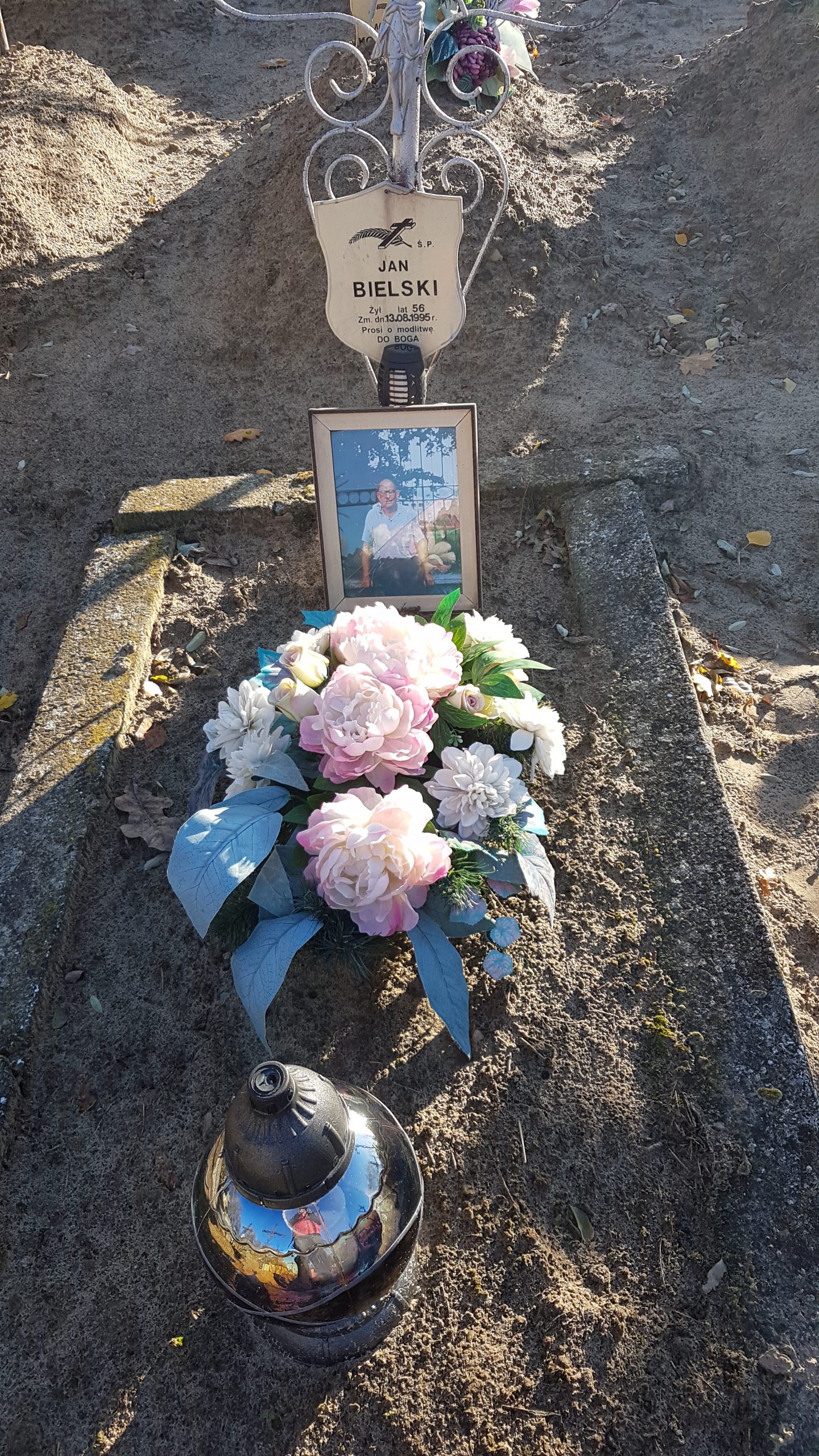 Dziś na grobie Pana Jana umieściłem JEGO wizerunek. Jest to chyba jedyna fotografia (jeśli macie też, to proszę przyślijcie do nas) jaką zrobiłem Panu Bielskiemu w roku 1985.