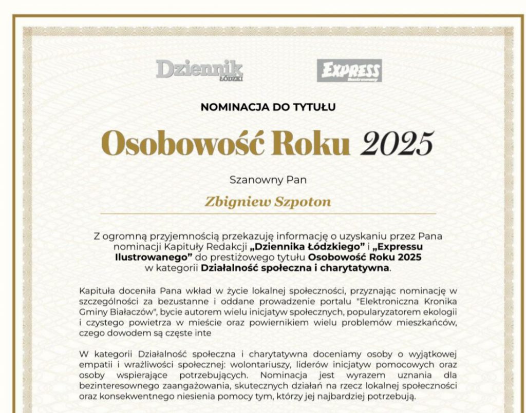 Miło nam poinformować, że nasz kolega ZBYSZEK SZPOTON, którego znacie nie tylko z łamów portalu ,,Elektroniczna Kronika Gminy Białaczów” został nominowany w plebiscycie organizowanym przez ,,Dziennik Łódzki” do ,,OSOBOWOŚĆI ROKU 2025” W KATEGORII