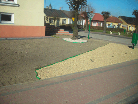 31.03 ze swoimi narzędziami zgłosiło się już o 9.00 czterech bezrobotnych (odsyłam do fotografii). Dzięki nim został przekopany cały skwer oraz przywieziony i rozsypany żwirek dekoracyjny.Do godziny 13 .00 pracowało łącznie 14 osób (nazwiska wymienione w poprzednim newsie). Następnego dnia po dokupieniu brakujących elementów wykończeniowych (agro-włókniny i obrzeży rabatowych) trzy osoby ze stowarzyszenia T. Wilk , K. Nojek, T. Długowolska i Jacek Lis (bezrobotny) ukończyły przygotowania skwerku do zasadzenia roślin ( jak obok). Przy okazji naszej akcji lub za naszym przykładem zostały przyspieszone prace porządkowe podlegające pod Urząd Gminy : wymienione dwa zniszczone znaki drogowe w rynku , podcięty drzewostan, uprzątnięty teren przy wejściu do GOPS-u i koło piekarni.